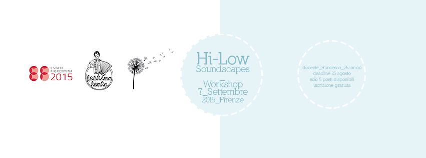 Festina Lente con il musicologo e musicista elettroacustico Francesco Giannico, fondatore di AIPS, presenta il workshop “Hi&Low” (dal paesaggio sonoro a bassa ad alta fedeltà) per il 7 settembre 2015. La partecipazione è gratuita ed i posti disponibili sono 5, gli interessati non si attardino.